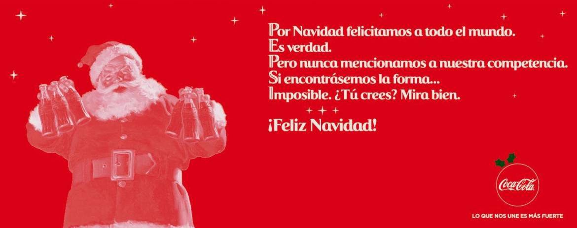 Tampoco se puede olvidar el ejemplo de Coca-Cola, que representa una de las marcas más expertas en publicidad y con mayor originalidad en la creación de sus anuncios y campañas publicitarias. Desde sus inicios, Coca-Cola se ha caracterizado por anuncios que pretenden transmitir todo el tiempo el mensaje del éxito y la felicidad. Un mensaje que representa su principal estrategia a la hora de vender sus productos. Los anuncios de Coca-Cola se pueden encontrar en cualquier lugar y en cualquier formato, tanto en cartelería como en el medio digital, siendo su omnipresencia otra de sus mayores características.