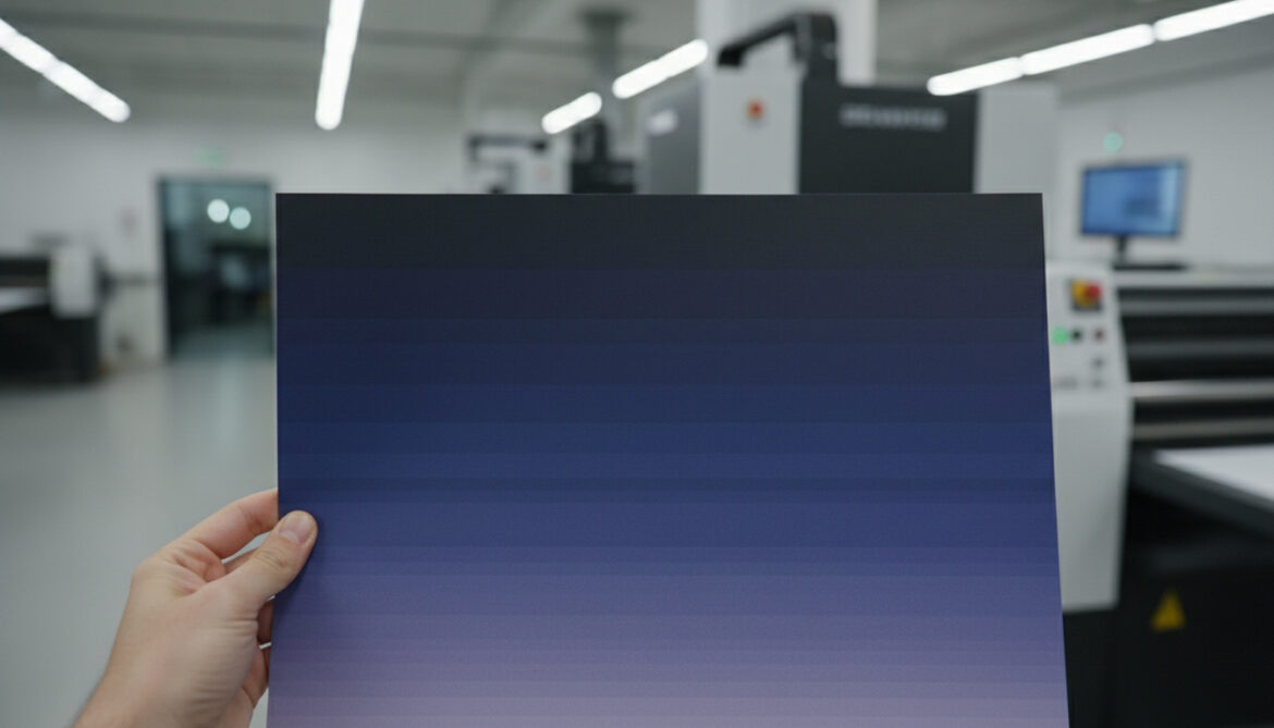 Y, al recibir el trabajo impreso: zonas ligeramente nubladas, variaciones de densidad, un resultado menos homogéneo de lo previsto. Los fondos sólidos oscuros se encuentran entre los elementos más difíciles de reproducir con total uniformidad en impresión.