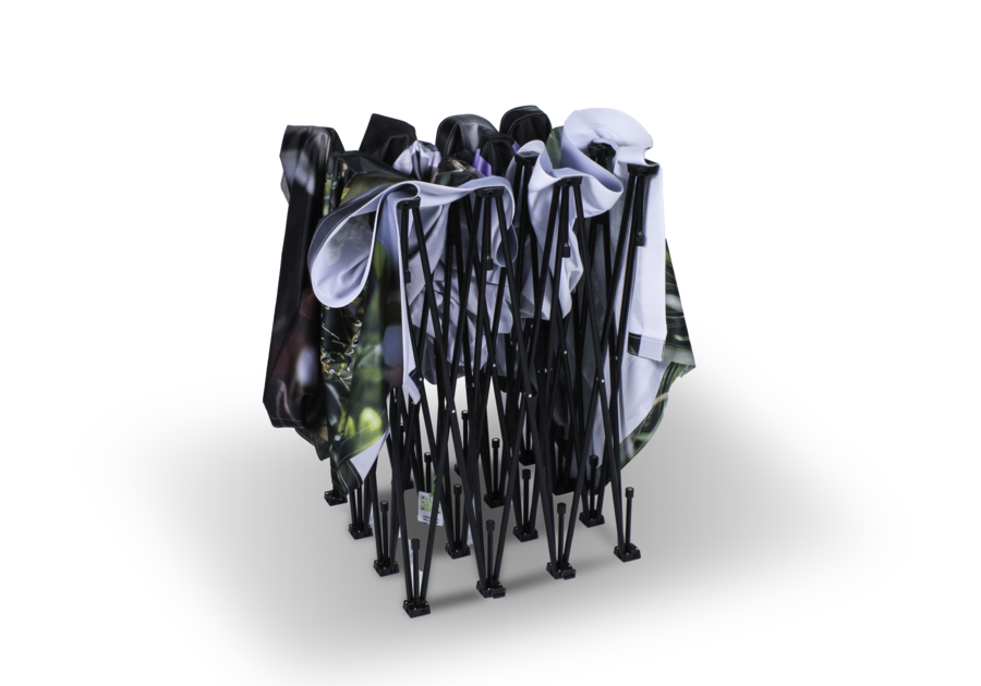 El visual de tela está impreso mediante sublimación, permanece fijado a la estructura incluso cuando el stand está plegado. Resultado: no hay que reajustarlo en cada uso.