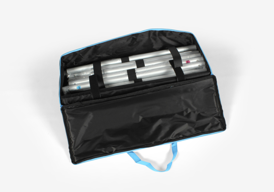 Una vez desmontado, el stand tubular ocupa muy poco espacio. Se guarda fácilmente en una bolsa de transporte y puede almacenarse sin dificultad, incluso en espacios reducidos.